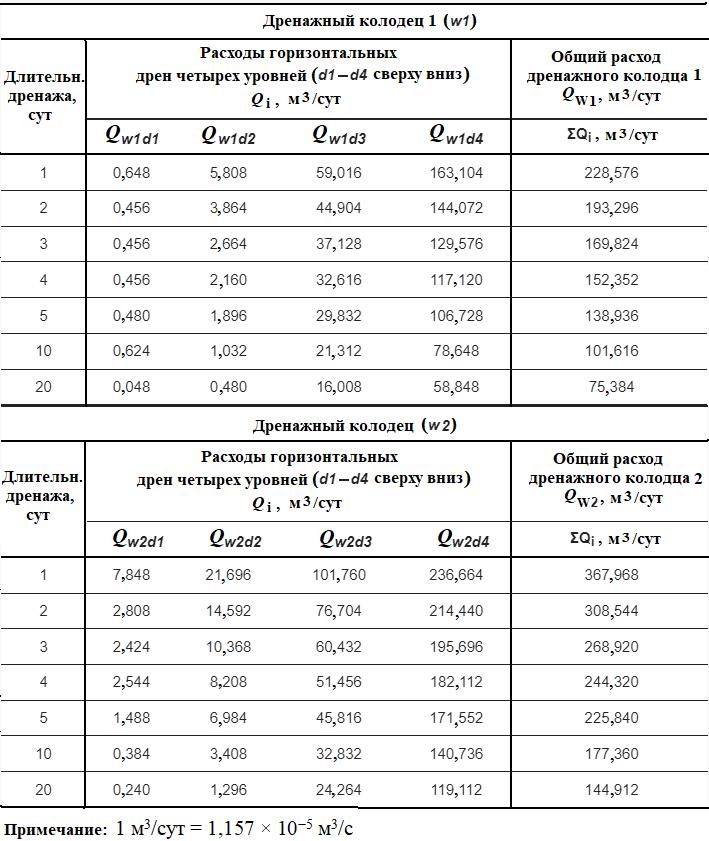 В таблице 2 приведены проектные параметры систем дренажных колодцев 1 и 2.