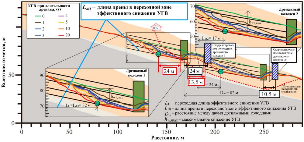 На рисунке 18 кружки показывают точки контакта горизонтальных дрен. Согласно расчетному снижению уровня грунтовых вод очевидно, что оба дренажных колодца (1 и 2) могут быть одновременно перемещены вниз по склону для повышения эффективности дренажа горизонтальными дренами внутри основного смещающегося тела оползня или в пределах потенциальной поверхности скольжения. Учитывая зону эффективного снижения УГВ с диапазоном 24 м вверх по склону от дренажного колодца 1 и зону неэффективного снижения УГВ с диапазоном 13,5 м вниз по склону от дренажного колодца 1, колодцы 1 и 2 могут быть перемещены на горизонтальные расстояния соответственно 24 и 10,5 м (24 м минус 13,5 м). На рисунке 18 показаны как исходные, так и скорректированные положения колодцев.