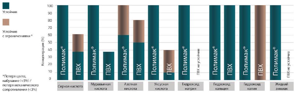 То есть в целом покрытие «ПолиМак®» намного более устойчиво к воздействиям химически агрессивных веществ по сравнению с ПВХ (рис. 6).