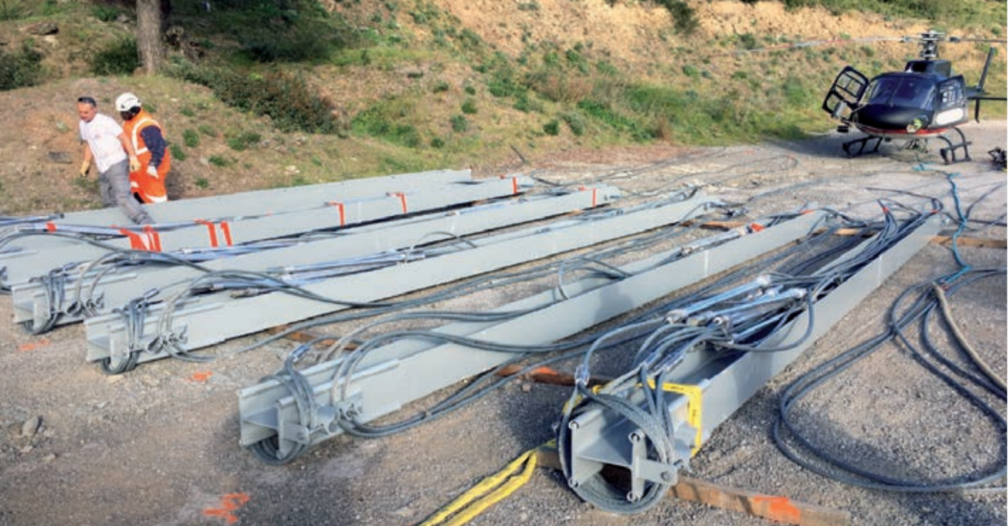 При транспортировке вертолетом опоры заранее смонтировали с передними и боковыми тросовыми оттяжками и гасителями энергии. Общий вес данных комплектующих составил менее 1000 кг, что было пределом возможности для вертолётной заброски.