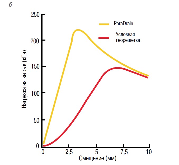 - увеличивает сопротивление армирующей прослойки на вырыв (приблизительно на 45%) и уменьшает ее смещение;