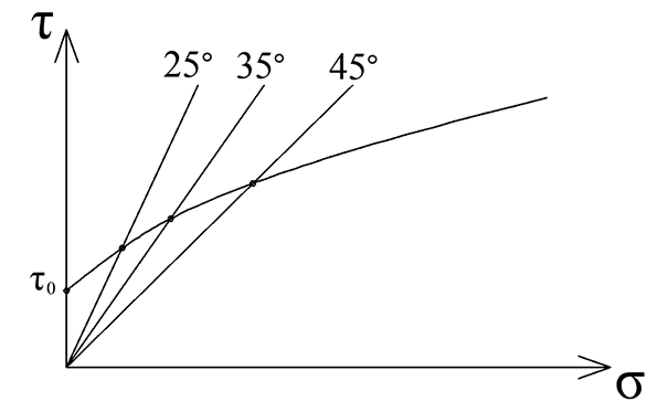 При каждом из углов наклона выполняется не менее 6 испытаний образцов-близнецов. Для каждого угла наклона вычисляют предел прочности τΘ и нормальное напряжение σΘ. Результат испытания представляется в виде пар средних значений предела прочности и соответствующих нормальных напряжений, а также коэффициентов вариации. Также по результатам строят предельную кривую прочности горных пород при срезе в зависимости от нормального давления, действующего на плоскость среза, в координатах σ и τ (рис. 2). По оси абсцисс откладывают для каждого из углов наклона матриц Θ значения нормальных давлений, а по оси ординат – соответствующие им значения пределов прочности породы при срезе. В результате может быть получена кривая, представленная на рисунке, где τ0 – предел прочности при чистом сдвиге.