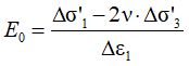 Модуль общей деформации Е0 определяется по результатам трехосных испытаний в консолидированно-дренированном режиме в полном соответствии с законом Гука для осесимметричного напряженного состояния: