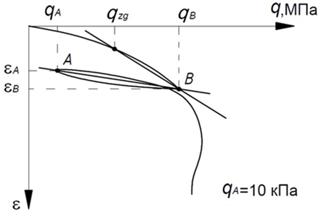 При изотропной консолидации девиатор в начале опыта отсутствует, и qzg = 0. Вторая точка диапазона qB на 60% больше бытового вертикального давления; данная величина принята для удобства сопоставления испытаний с кинематическим и ступенчатым приложением нагрузки. Разгрузка выполняется до величины девиатора 10 кПа, чтобы при использовании более распространенной камеры типа А сохранялся контакт штока и штампа. При анизотропной консолидации девиатор в начале опыта не равен 0, но диапазон определения модуля все равно на 60% больше бытового вертикального давления. Разгрузка в этом случае выполняется до величины девиатора также 10 кПа, то есть уходит ниже точки бытового напряженного состояния в предположении, что это больше соответствует диапазону изменения напряжений в основании.