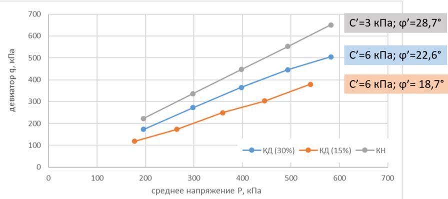 1. Отсутствие предельного состояния в трехосном КД испытании можно обойти проведением КН испытания, однако это требует квалификации исполнителя и возможности измерять поровое давление.