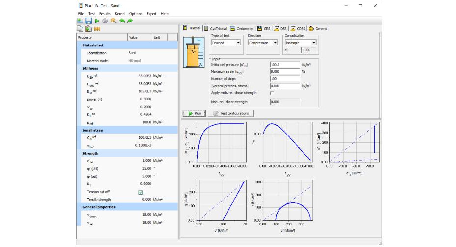 После того как вы определили свой набор параметров для модели HS (или HSS), вы можете провести испытания своего «цифрового грунта» в программе (виртуальной лаборатории) SoilTest, встроенной в программный комплекс PLAXIS. Это очень удобный инструмент, с помощью которого вы можете быстро проверить поведение модели в условиях нагружения, что будет аналогично настоящим лабораторным испытаниям грунта. Если у вас есть данные реальных лабораторных испытаний, вы можете выполнить дополнительную калибровку и валидацию параметров вашей модели. Доступен даже инструмент оптимизации параметров.