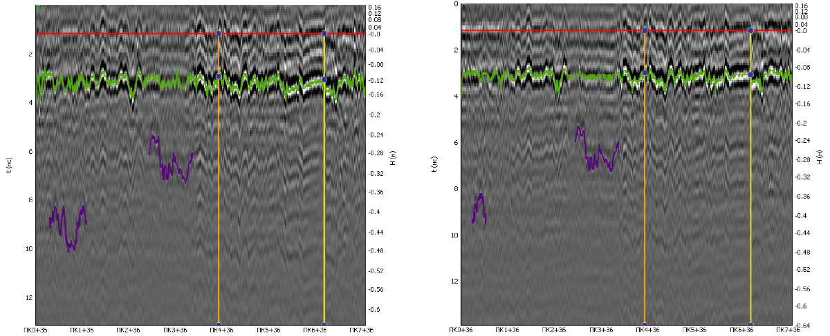 Обработка радарограмм производилась в программном обеспечении GeoReader (ООО «ТИМ») с ассоциацией контрольных выработок для дальнейшего уточнения количественной информации по конструктивному слою (скорости, диэлектрической проницаемости и толщины).