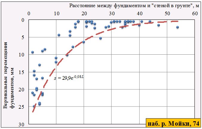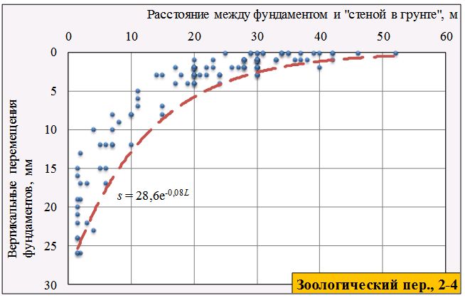 Фундаменты соседних зданий при устройстве вблизи них траншейной «стены в грунте» получают дополнительные осадки, значения которых могут достигать нескольких сантиметров и доходить до 70% от суммарных дополнительных осадок окружающей застройки за весь период строительства.