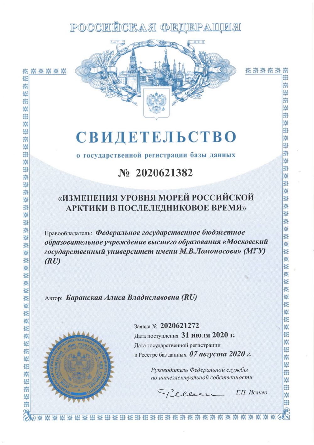База данных официально зарегистрирована в Роспатенте и носит название «Изменения уровня морей Российской Арктики в послеледниковое время».