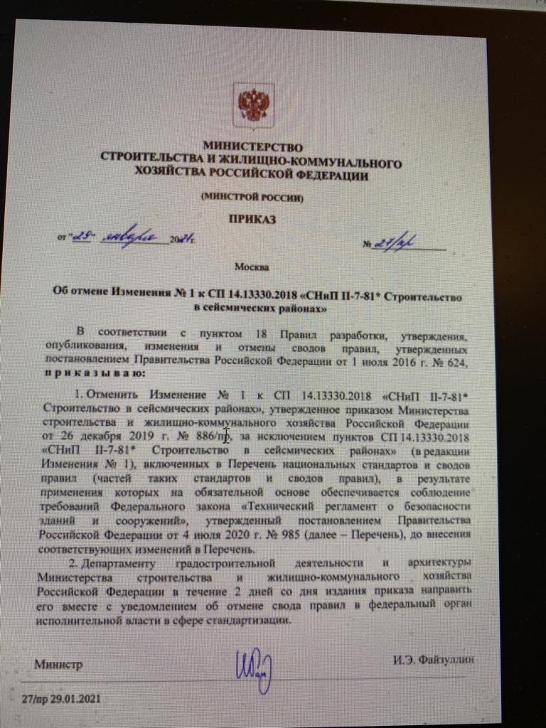 Москва. 3 февраля. ГеоИнфо – По профессиональному строительному сообществу со 2 февраля расходится информация о том, что приказом Минстроя РФ от 29 января 2021 года отменены карты ОСР-.2016 Согласно распространенному тексту приказа, министр распорядился отменить Изменение №1 к СП 14.13330.2018 «СНиП П-?-81* Строительство в сейсмических районах», утвержденное приказом Министерства строительства и жилищно-коммунального хозяйства Российской Федерации от 26 декабря 2019 года №886/пр, за исключением пунктов СП 14.13330.2018, включенных в Перечень национальных стандартов и сводов правил, обеспечивающих соблюдение требований ФЗ «Технический регламент о безопасности зданий и сооружений», до внесения соответствующих изменений в Перечень.
