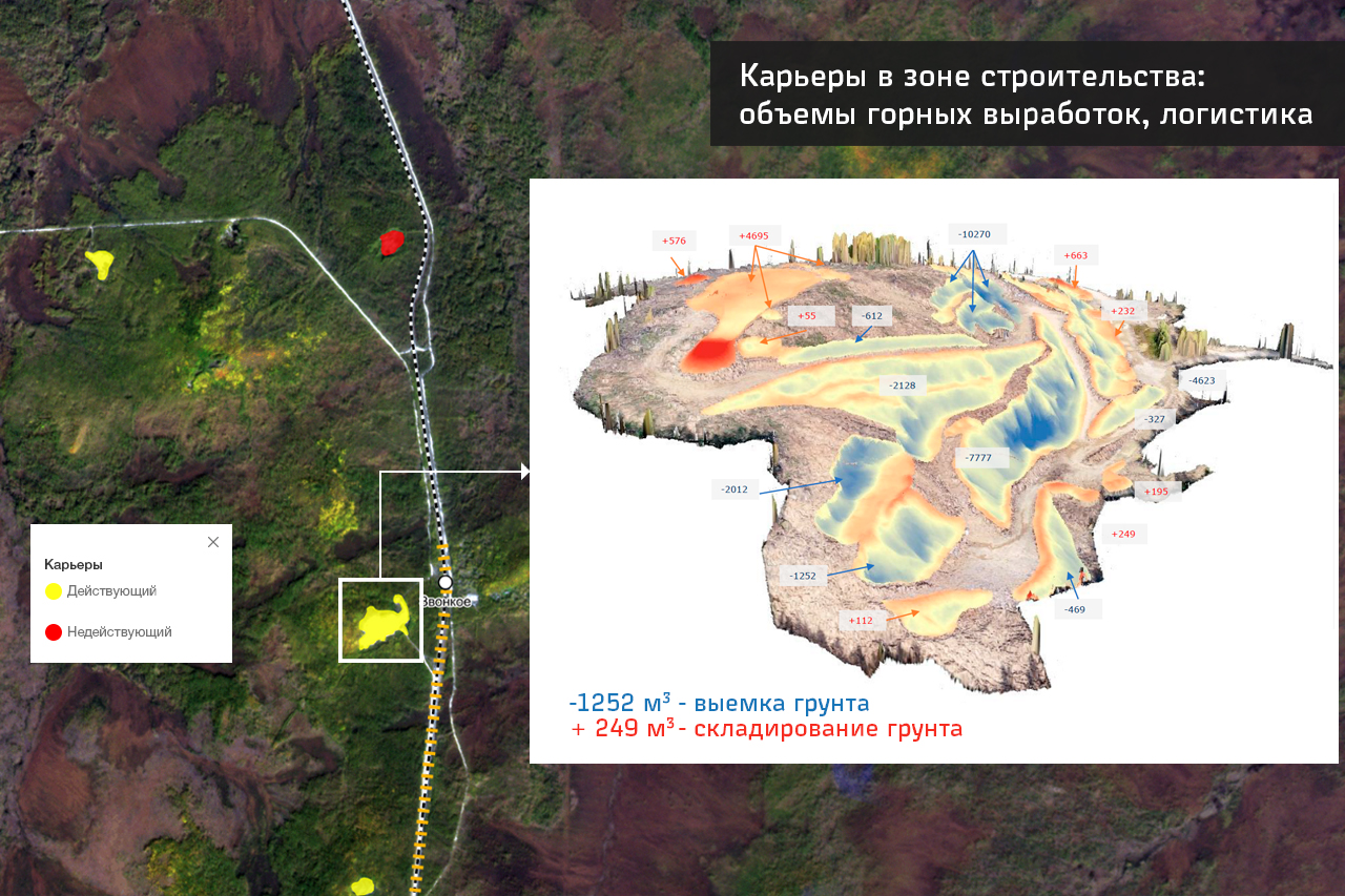 Пользователи получают важную для оптимизации логистики информацию о карьерах полезных ископаемых, расположенных рядом со строящимися объектами. В решении предусмотрен функционал отслеживания неблагоприятных явлений вблизи строящейся инфраструктуры – пожаров и наводнений.