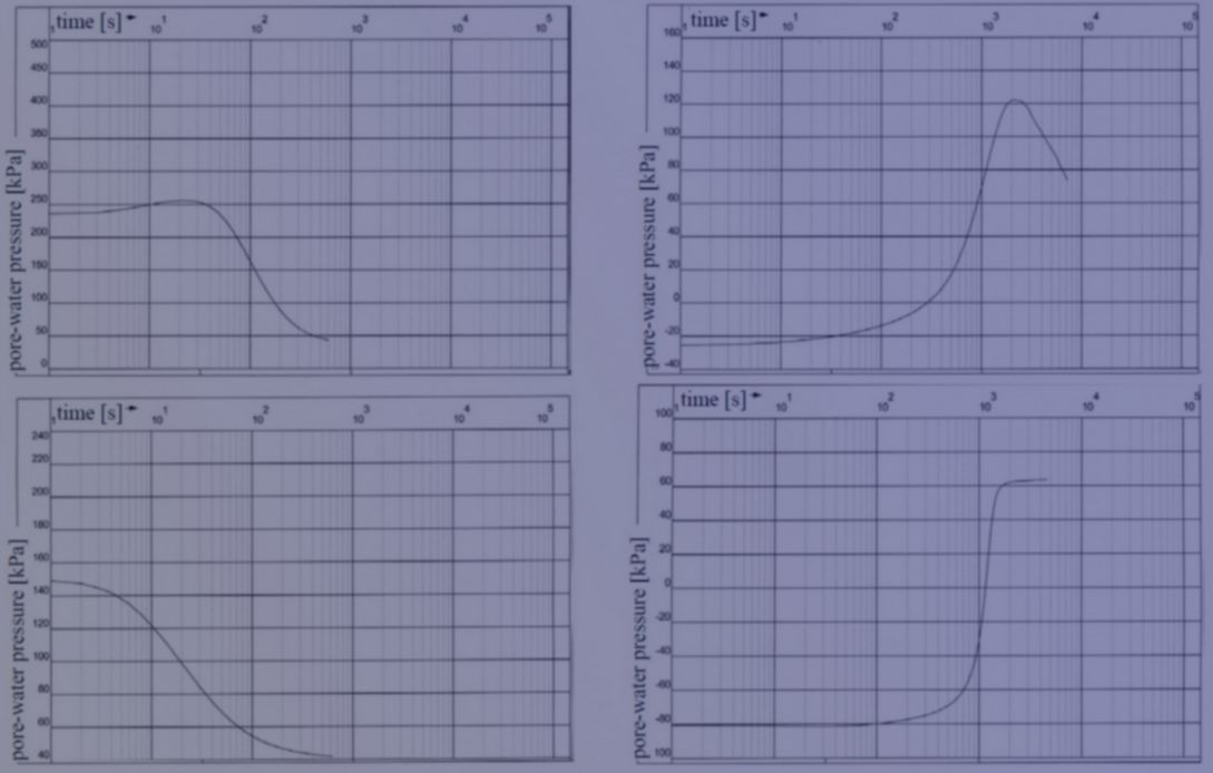 В зависимости от относительных величин поровых давлений, создаваемых действием сжатия и сдвига, возникающее избыточное поровое давление может быть меньше, равно или больше начального гидростатического давления. В чистых песках и гравийных грунтах наблюдается, по существу, дренированный отклик, и измеренные поровые давления являются гидростатическими. В большинстве других случаев происходит первоначальный недренированный ответ, за которым следует дренирование. Как только зондирование прекращается, избыточные давления рассеиваются и, в конечном итоге, достигают предтестового гидростатического значения. Поскольку скорость снижения избыточного порового давления зависит от коэффициента фильтрации окружающей грунтовой среды, последний можно оценивать с помощью кривых диссипации.